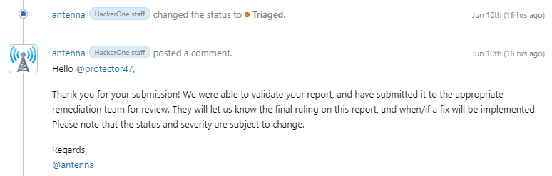 I have reported this vulnerability to a HackerOne private program and my report got triaged.