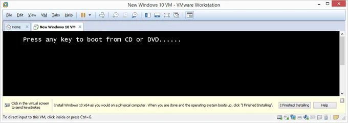 VMware Workstation will create the virtual disk you specified in Step 6 and then turn on the virtual machine automatically. This process might take a while, but you can watch the progress bar for an estimation of when it will finish.