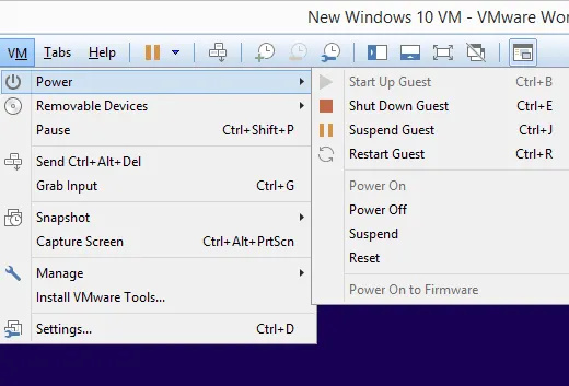 At any time when the VMware virtual machine is on, you can shut it down or restart it from the VM > Power menu. This is also how you suspend the VM, which means to pause it so that you can resume at that exact same point the next time you access it. This is different from powering it on from an off state where you have to log back in again, open programs and files, etc.
