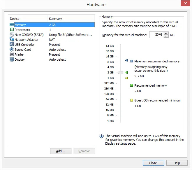 VMware Workstation recommends a specific amount based on how much you have installed, but you can adjust the memory to anything you like (though it’s best to stick to the recommended level). Different operating systems require different amounts of memory (e.g., Windows 10 needs more than Windows 2000).