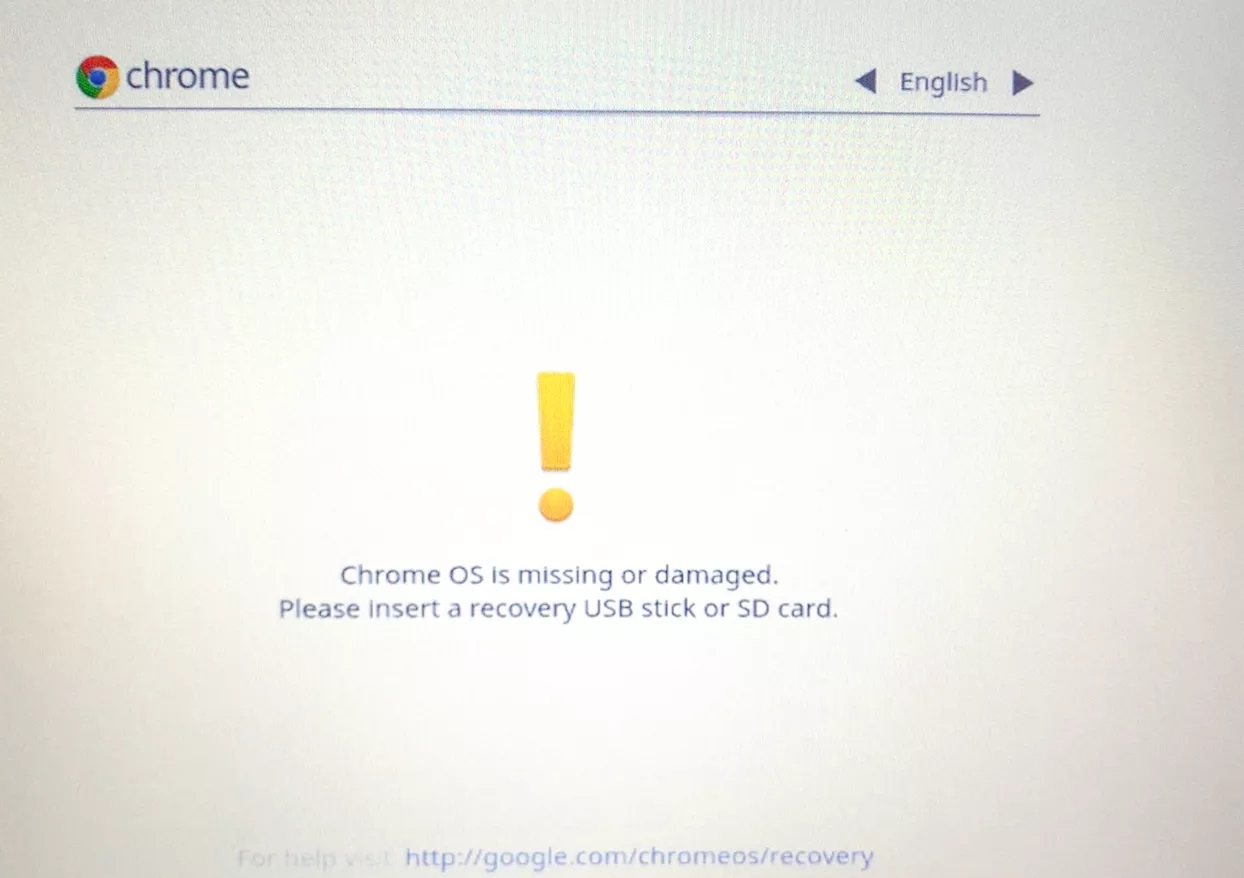 - After the reboot is complete, a screen with a yellow exclamation point and a message that Chrome OS is missing or damaged should appear. Next, utilize this key combination to initiate Developer Mode: CTRL+D .