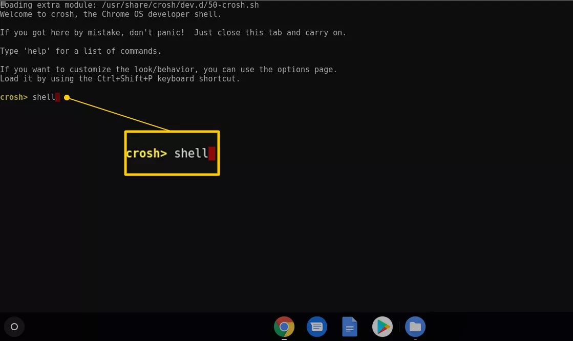 A cursor should now be displayed next to the crosh> prompt, awaiting your input. Type shell and press the Enter key.