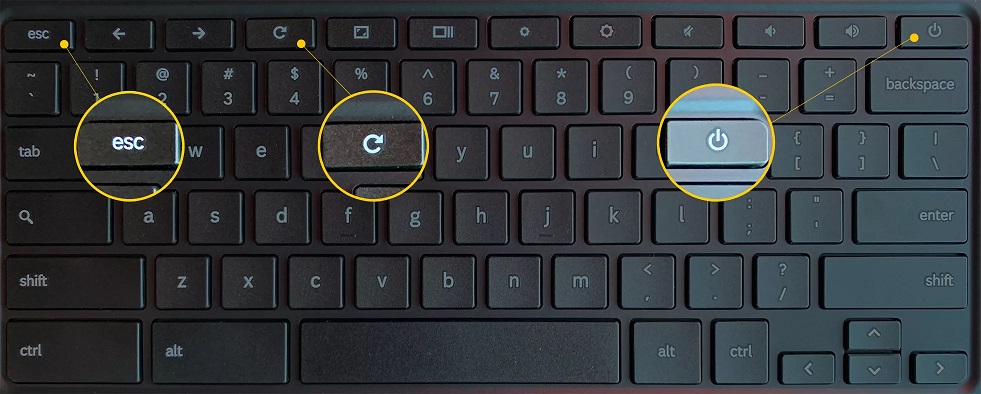 - With your Chromebook on, hold the Esc and Refresh keys down simultaneously and tap your device’s power button . A forced reboot should begin, at which point you can let go of the keys.