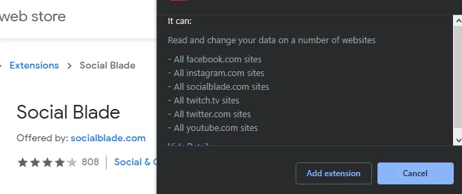 When you go to install a browser extension, the first thing you should do is check for these permissions. They can tell you a lot about what the browser extension can do once it is installed. Let’s take Social Blade, for example.