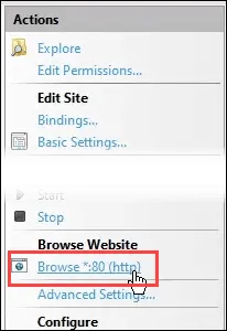 - On the right side of the IIS Manager look under the Browse Website section. Click on *Browse :80 (http). That will open the default web site in your default web browser.