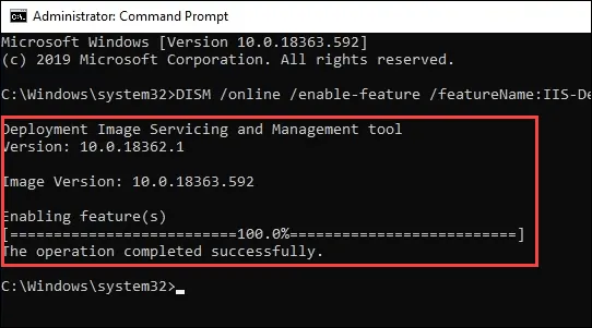 - You’ll see a progress bar appear. Once it reaches 100.0% and you see the message, “The operation completed successfully.” you can close the Command Prompt. IIS is installed.