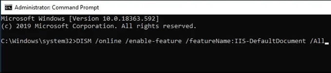 - Type in the command DISM /online /enable-feature /featureName:IIS-DefaultDocument /All and press Enter .