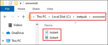 - After IIS is installed, open File Explorer . Navigate to C:\intepub\wwwroot . That’s where the files that make up the website need to be stored. You’ll see the default IIS web page file, iisstart.html , and the image shown on the page, iisstart.png . This is where you’ll save your first web page.