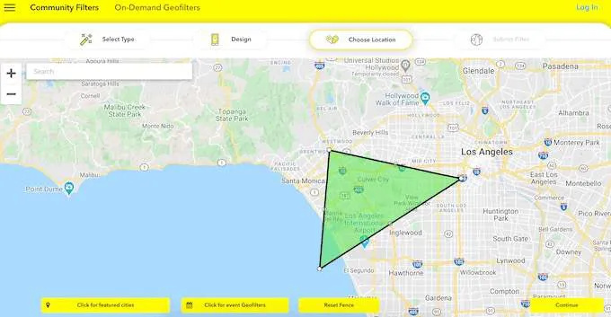 - Under Location , draw a fence to select the area for your Geofilter. All Snapchat users on the inside of that fence will be able to use your filter.