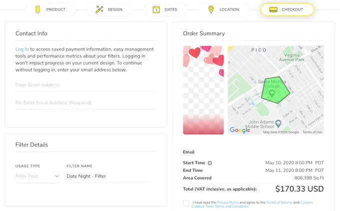 Follow the same algorithm, create your own design, set the dates, and the area, then pay and submit your Snapchat filter for approval.