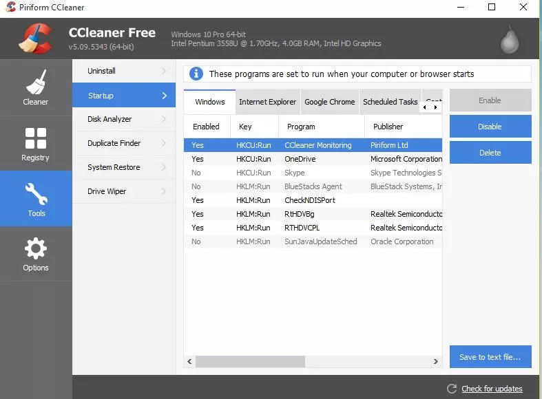 Is basic and better than nothing. In Step 2 makes use of CCleaner since you have already got CCleaner and Option 3 requires another download but will help you identify startup items you don’t recognize. Now for the things you don’t see. Utilizing CCleaner, you’ll be able to look at Tools, Startup and see all of the items which might be loading. Here you need a slight knowledge however you should use some common sense. It’s safe to remove printer startup items if you don’t use your printers advanced features, for example. You can also Google some of the startup names to see what they’re. With CCleaner, you will have the advantage of having the ability to disable an item and remove it later once you recognize you don’t need it. Sometimes you find a lot of items from Java, Adobe, QuickTime, and iTunes that don’t need to be there.