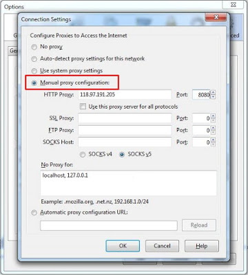 Now click ‘Settings’ and select “ Manual proxy configuration: ” – paste the proxy & port-8080 where you got from above 2 links-Proxynova.com or hidemyass.com and tick the box that says “Use this proxy server for all protocols” and finally click OK in settings dialog box.