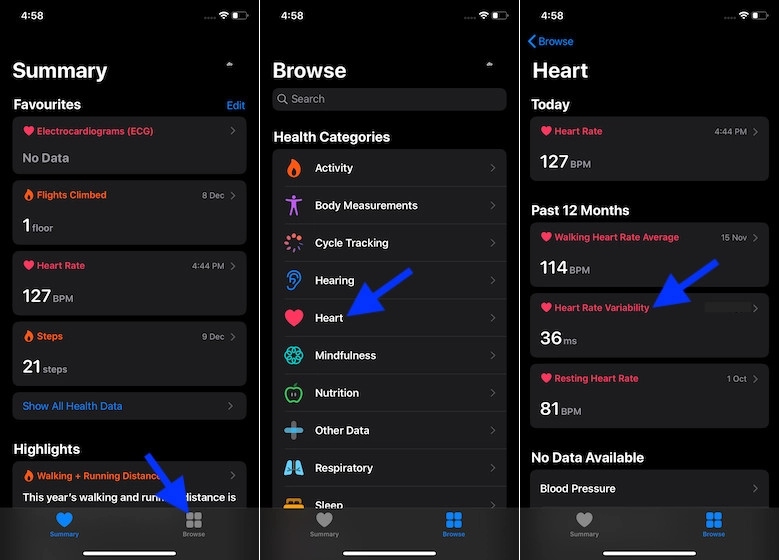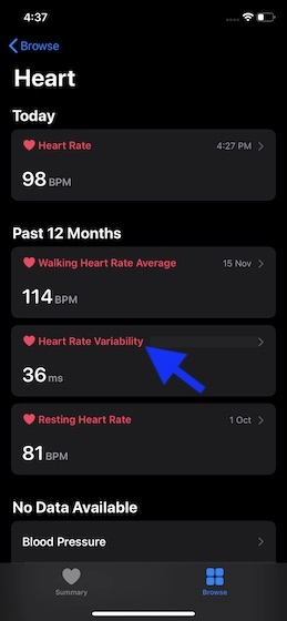 - Open Health app > Browse tab > Heart > Heart Rate Variability.