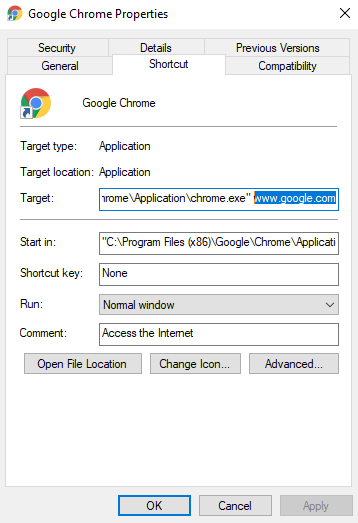 - Now in the Target box, Without removing anything, give a single space and add at the end www.google.com