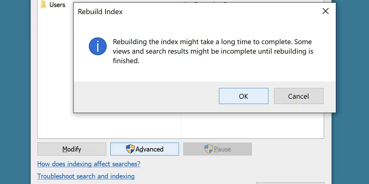 Click this button and hit Ok. Windows will begin rebuilding the search database. This will take some time and may disable searching for a short period.