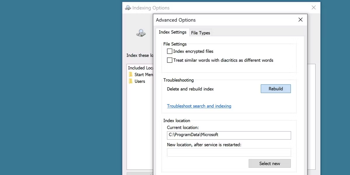 Rebuilding the Search Index is straightforward. You first need to access Indexing Options.