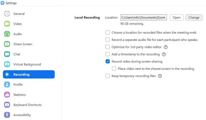 Zoom will automatically create a folder on your computer to store recordings. Click Change to select a different location.