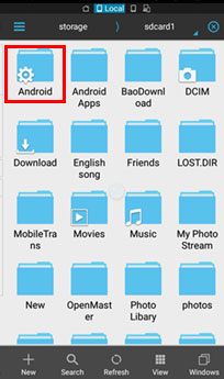 - Open the ES File Explorer App. First, go to the storage/SD card. There you will find the Android folder, which holds all the data related applications.