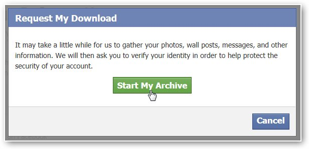 - Then it will pop up a box named “Request My Download” , which tells you that it will a little while to gather your Facebook information. Click the green button “Start My Archive” again to start gathering all of your Facebook information.