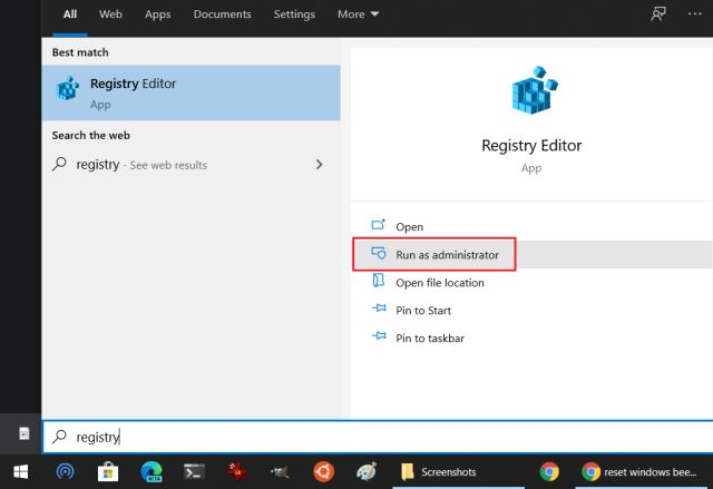 - Once you are in the Safe Mode, search for “registry” in the Windows Search box. After that, click on “Run as administrator” in the right pane.