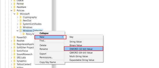 - Right-click on “Windows Defender” and select New → DWORD (32-bit) value . Name the file “DisableAntiSpyware” and click on the “Ok” button.