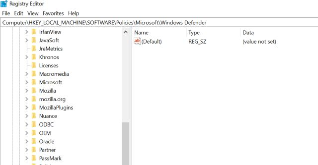 HKEY_LOCAL_MACHINE\SOFTWARE\Policies\Microsoft\Windows Defender