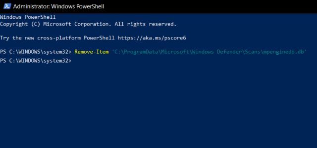 - After that, copy the command below and paste it on your PowerShell window . Following that, hit enter. This will delete the mpengine.db file from your PC.
