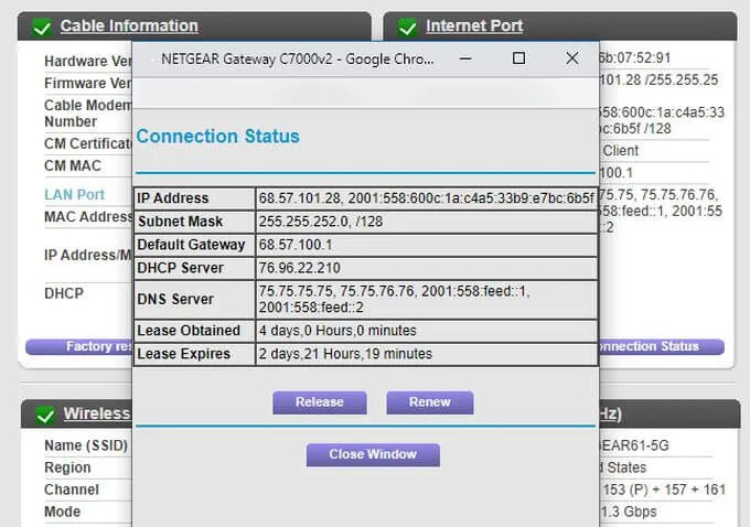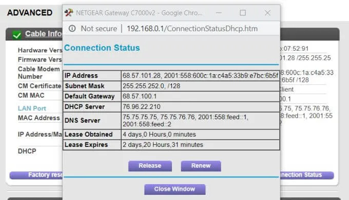 - At the bottom of this window you’ll see the Release and Renew buttons. First, select Release to release the router’s current IP address back to the ISP. At this point, the router will no longer have an active internet connection.