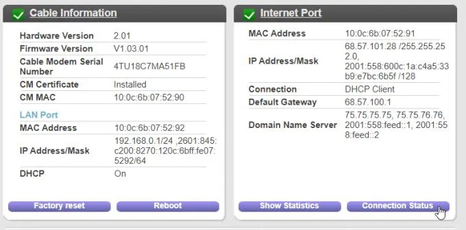 - Every router has its own menu system. Find the area that shows the Internet connection status. For example in the Netgear router, select Advanced and then select Connection Status under Internet Port .