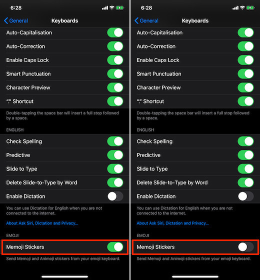 That’s it! Now, quit the Settings app. The change will come into effect instantly. To check out, simply bring up the default keyboard inside any app like Messages. The Memoji stickers will be gone. As it’s an opt-in feature, you can unhide the stickers, if you ever want to get them back. To do so, repeat the same steps mentioned above and then turn on the switch in the end.