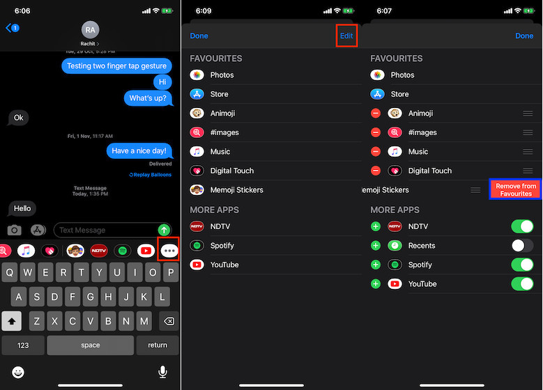 This trick is for the folks who want to remove the funny characters from Favorites. If you are one of those who hate to see these characters, simply swipe right on the iMessage app drawer > More (…) > Edit. Now, tap on the red button to the left of Memoji Stickers and hit Remove from Favorites . In the end, make sure to tap on Done to finish.