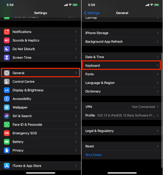 - Now, tap on General and choose Keyboard.
