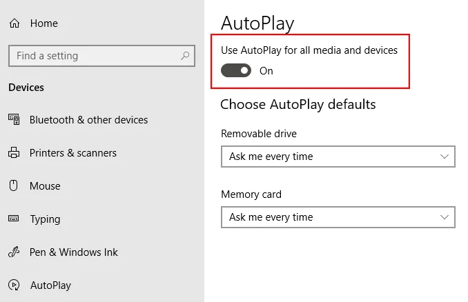 Go to Settings (Windows + I) > Devices > AutoPlay .