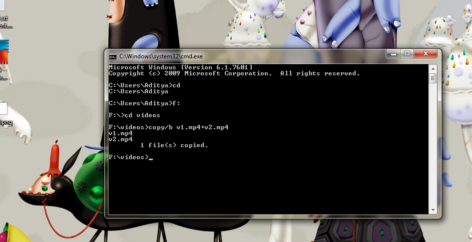 - Type copy/b v1.mp4+v2.mp4 (this command combine v1.mp4 and v2.mp4 video at v1.mp4 and note that there is the space between b and v1.mp4).