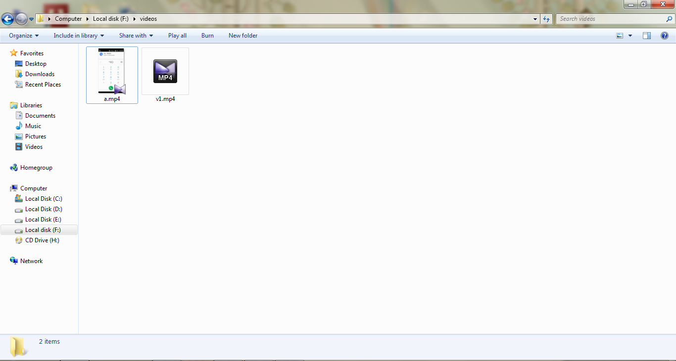 - cd videos and hit enter (My videos are in the f: drive and the folder name is videos, suppose folder name is abcd in which your videos are stored then you have to type the command as cd abcd).