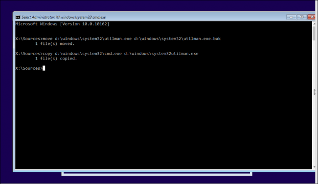 move d:\windows\system32\utilman.exe d:\windows\system32\utilman.exe.bakcopy d:\windows\system32\cmd.exe d:\windows\system32\utilman.exe