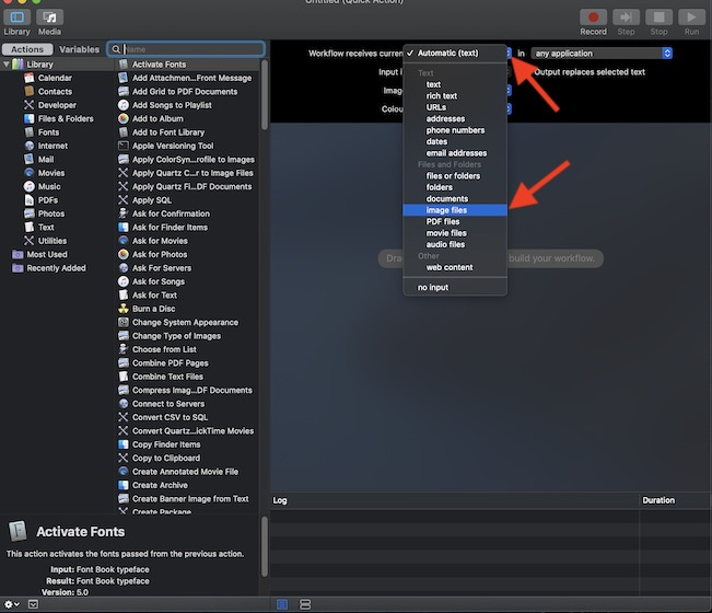 - Next up, click on the Service receives selected/ Workflow receives current dropdown and then make sure to choose Image Files.