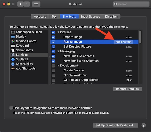 - Next, click on the Shortcuts tab and choose Services from the sidebar. Then, select the Resize Image option.