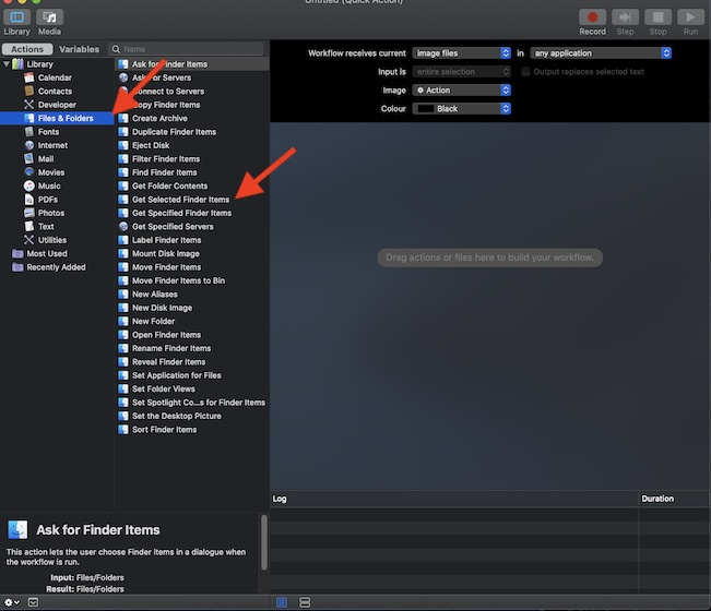- Up next, choose Files and Folders options located in the sidebar. After that, drag the “Get Specified Finder Items” to the workflow area.