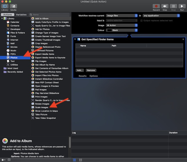- Now, choose Photos in the Actions sidebar . Then, drag Scale Images option to the workflow area.