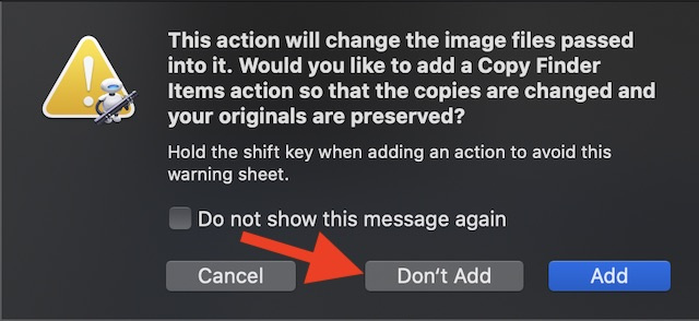 - A popup message will show up on the screen saying, “This action will change the image files passed into it. Would you like to add a Copy Finder Items action so that the copies are changed and your originals are preserved? To keep everything straightforward, select Don’t Add. (But you can choose to go with Add if you want to.)