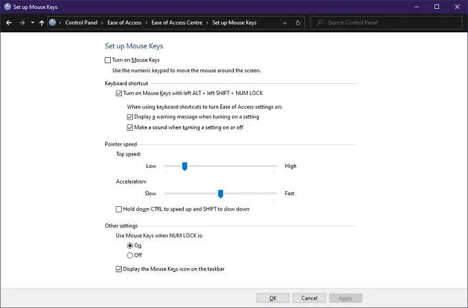 You can also reach a more advanced set of Mouse Key settings by going to Control Panel > Ease of Access > Ease of Access Center > Make the Mouse Easier to Use > Set Up Mouse Keys
