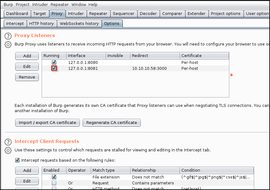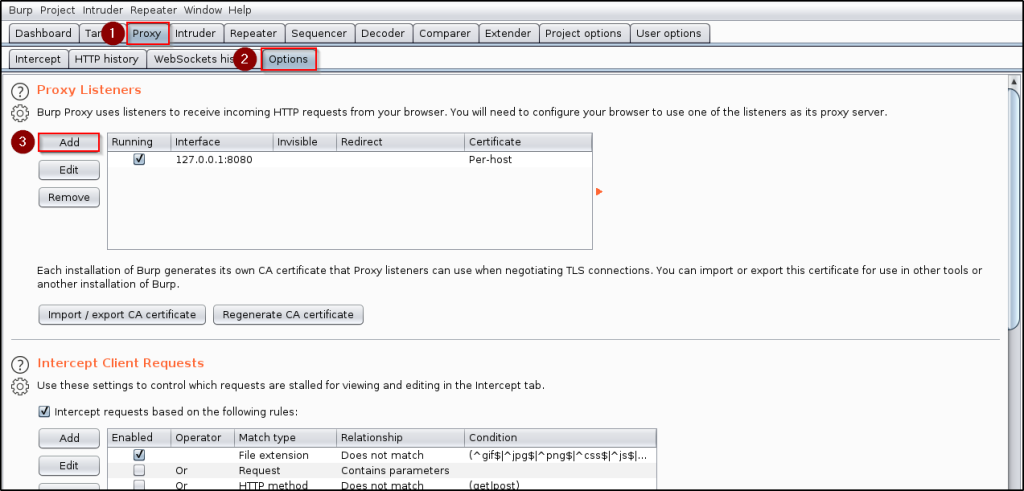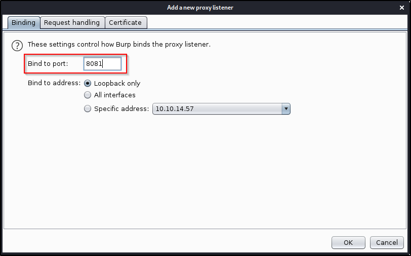 Let’s spin up BurpSuite and navigate to the Proxy tab. Let’s then go into Options , and Add a new proxy listener.