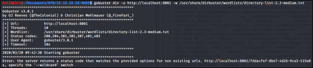 Very quickly we get a response back that states “ Error: the server returns a status code that matches the provided options for non existing urls. http://10.10.10.58:3000/febbf4ec-069f-4b87-a671-a07ses, specify the ‘–wildcard’ switch “