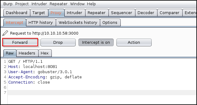 Heading back to Burp, we have a chance to modify the request if we desire. I will go ahead and click Forward . You may need to click it a few times if multiple requests are being sent.