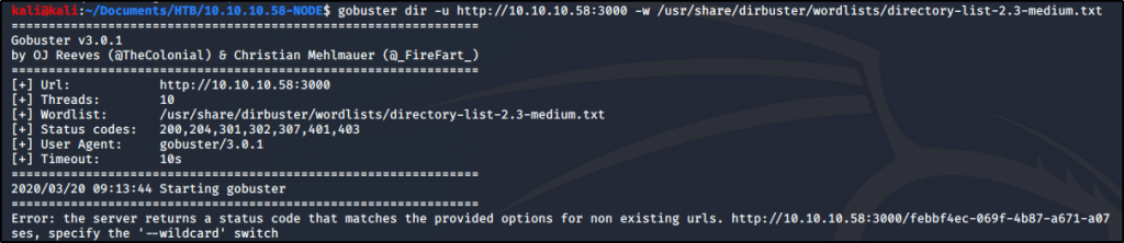 gobuster dir -u http://10.10.10.58:3000 -w /usr/share/dirbuster/wordlists/directory-list-2.3-medium.txt --wildcard