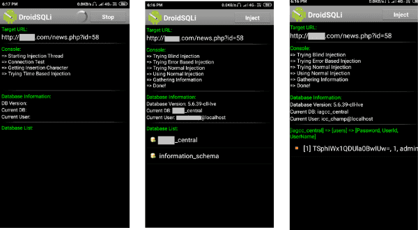 Now open up the DroidSQLi app and put the URL of the target site and click on the ’ Inject ’ at the top right corner. It will start every possible SQL injection method such as Time Based Injection, Error Based Injection, Evasion method, Blind injection and also normal Injection.