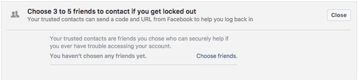 Trusted Contacts are your effective solution if you lock yourself out from Facebook account. In case of some urgencies, 3-5 people can help you regain access to your account. In the same Settings tab, you can choose 3 to 5 people that you really trust. And, in case if you’re not able to access your account, these people would send you a link. It’s a superb way to overcome almost all types of difficulties.