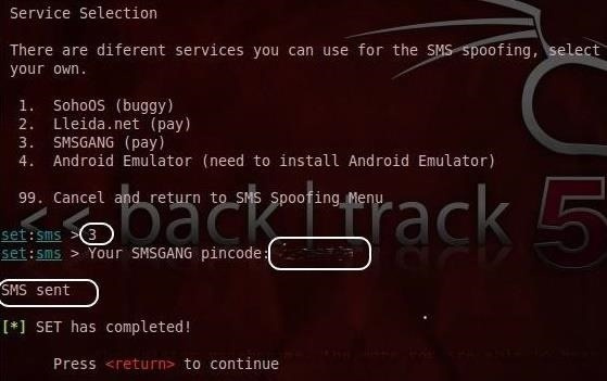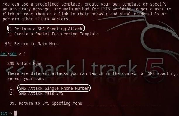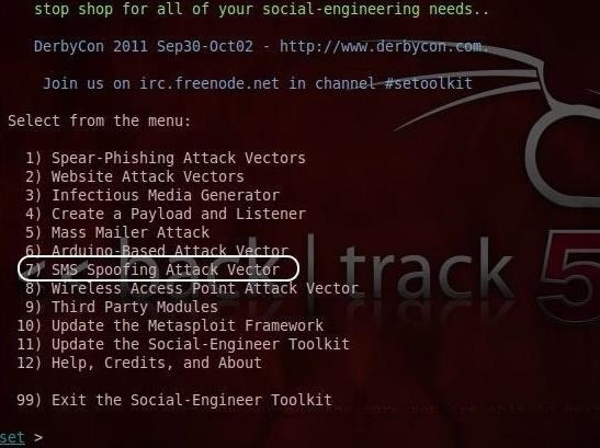 This will start the SET opening screen as seen below. SET is capable of numerous social engineering attacks. previously used SET to spear phish in BackTrack, but the one we want this time is “SMS Spoofing Attack Vector.” To begin this attack, Select #7.