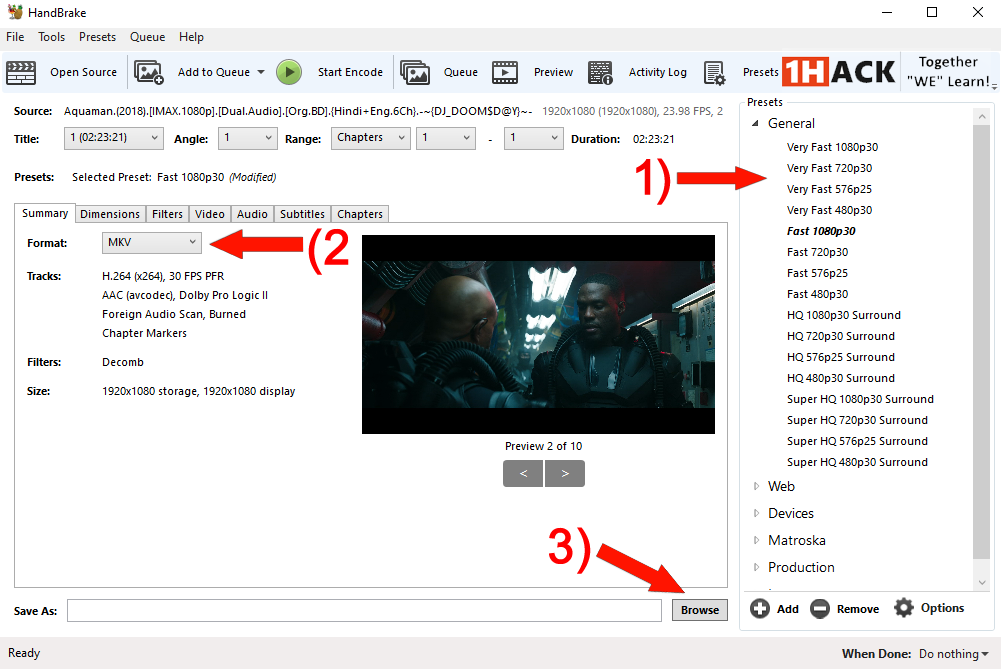 Step 2 : Summary tab > Change Output Settings from Container MP4 to MKV, In new and current versions it’s named as Format instead of Container
